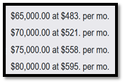 | $25,000.00 at $148. per mo. | $45,000.00 at $299. per mo. | $65,000.00 at $433. per mo. | $85,000.00 at $566. per mo. | ||